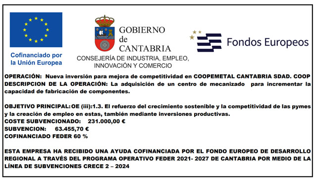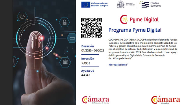 Coopemetal Cantabria, Soc. Coop. ha sido beneficiaria de Fondos Europeos, cuyo objetivo es la mejora de la competitividad de las PYMES, y gracias al cual ha puesto en marcha un Plan de Acción con el objetivo de reforzar la digitalización y la competitividad de las pymes durante el año 2024 Para ello ha contado con el apoyo del Programa Pyme Digital de la Cámara de Comercio de Cantabria. #EuropaSeSiente” (Cartel)